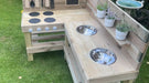 All our Mud Kitchens are made from sustainably sourced outdoor treated wood meaning they can live outdoors and be used whatever the weather!